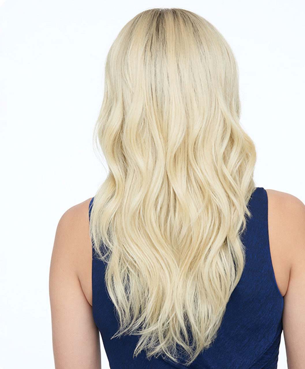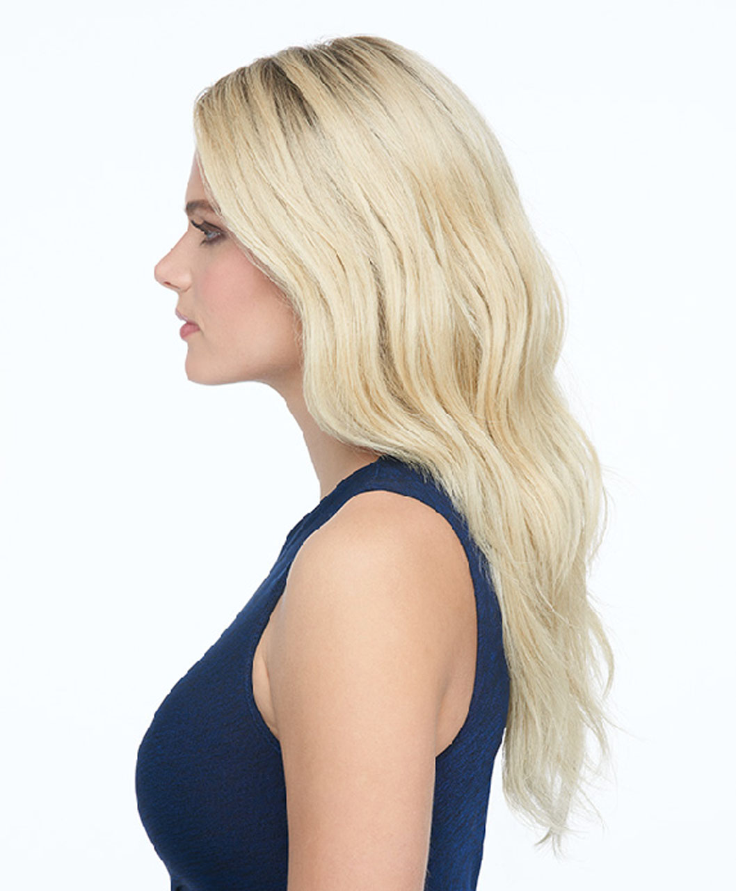 This long and softly tapered silhouette reflects the height of “undone glamour.” Soft waves at the crown and sides become slightly tighter at the ends. The overall effect is free-formed movement with a modern edge. Long layers throughout give the overall appearance of a one-length cut and keep the style light with just the right amount of body. The lace front monofilament top allows for a multitude of parting options and the 100% hand-tied base offers the ultimate in a light, cool fit. This is a heat styleable synthetic wig.
